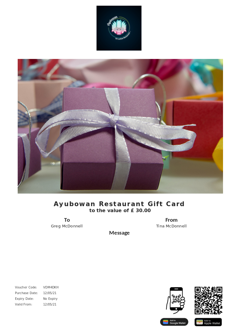 Ayubowan Restaurant allows you to purchase instantly printable gift vouchers, special offers and tickets using the Voucher Connect platform.